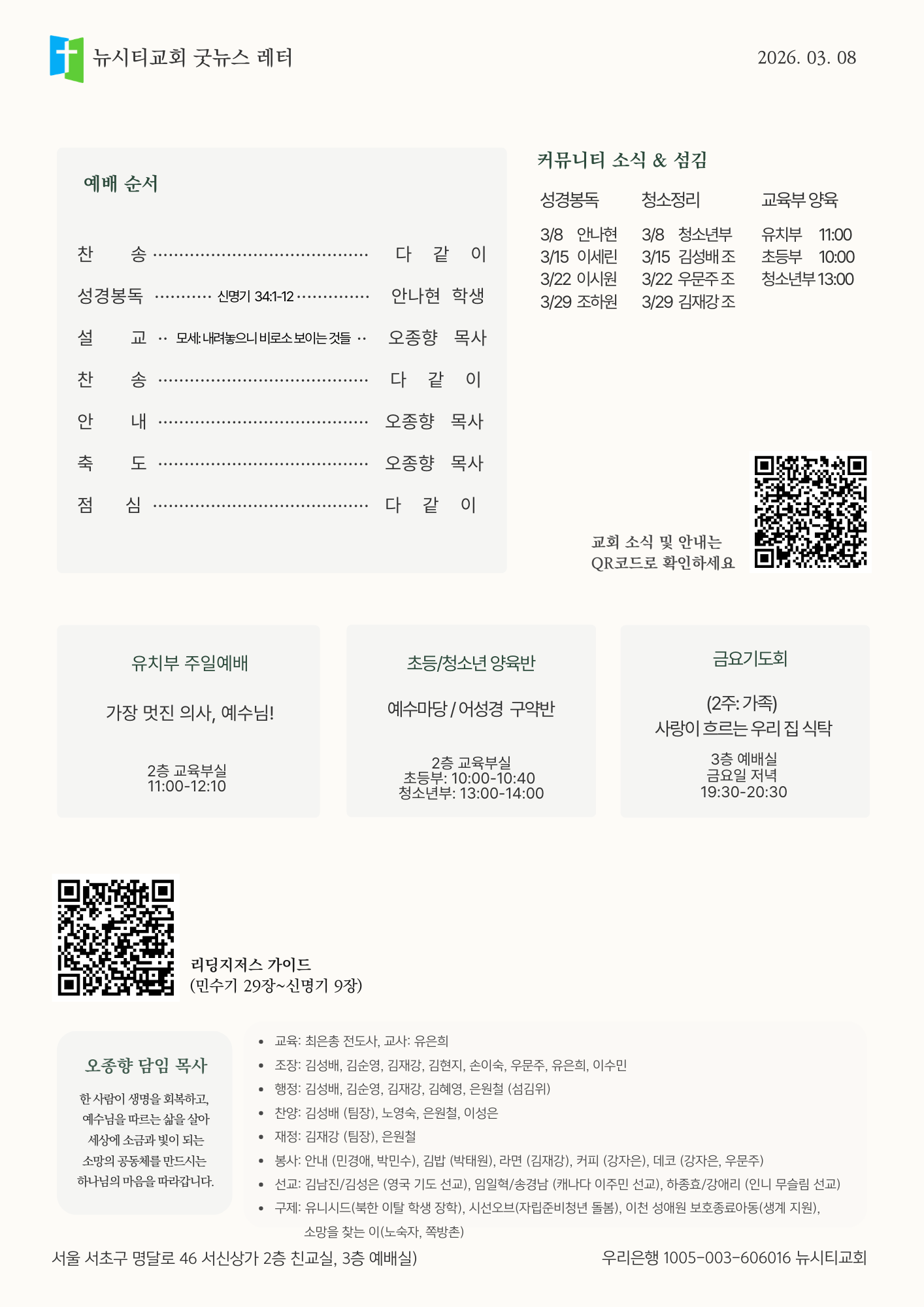 - 3월 주일예배 설교, 금요기도회 설교의 본문이 나왔습니다. 미리 성경본문을 여러 번 읽고 준비해주세요.